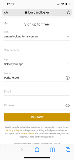 La inscripción en BuscaRollos es gratuita tanto para hombres como para mujeres. Para realizarla, sólo tiene que rellenar algunas informaciones clásicas como: